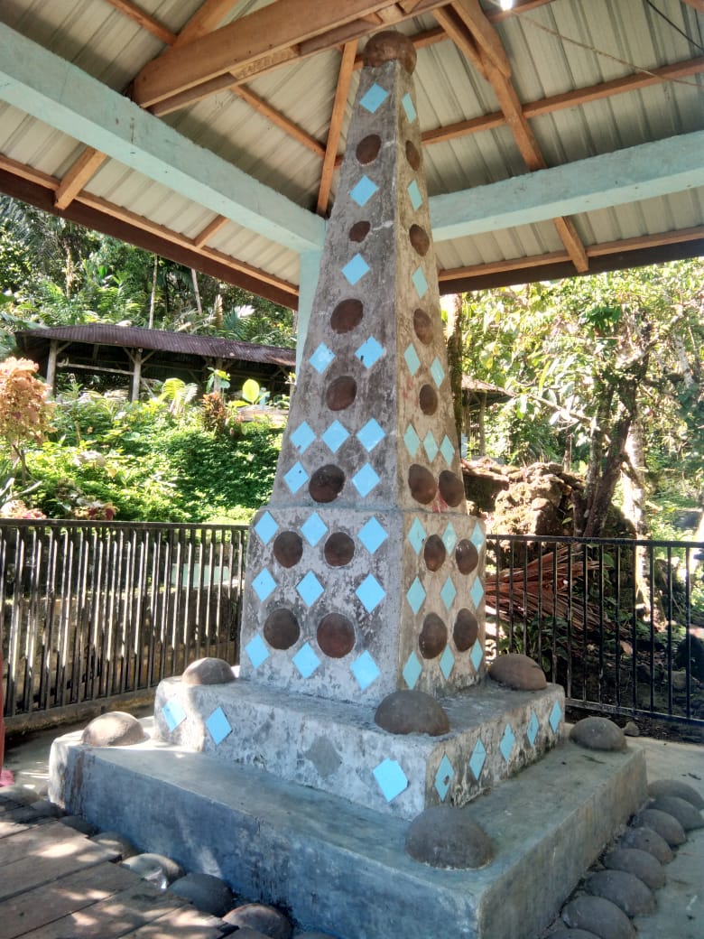 tugu perjuangan ini berbentuk kerucut dengan tinggi sekitar kurang lebih 3 meter berwarna putih dengan garis pinggir berwarna hijau dan lebar pada bagian bawah sekitar kurang lebih 1 meter dan pada bagian atasnya sekitar 80 cm yang mana pada hujung tugu tersebut berdiri tegak besi berbentuk bambo runcing dengan ketinggian sekitar 30 cm sebagai bentuk symbol dari perjuangan dalam mempertahankan kemerdekaan republik indonesia. tugu tersebut dibangun diatas pertapakan yang dilapisi dengan batu dan semen yang berukuran seluan lebih kurang 3 meter persegi empat.